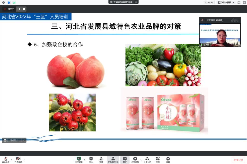 2022年11月18日,永利集团官网市场营销教学部专业带头人赵春霞博士受邀为我校承办的“河北省2022年三区科技人员培训班”进行了“乡村振兴背景下县域特色农业品牌建设思路与对策”的线上讲座。