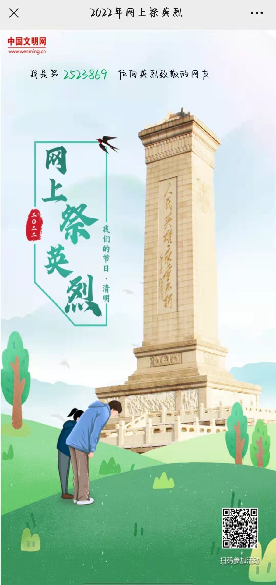 304永利集团官网入口的青年志愿者们以自己最真挚的情感、最真切的方式积极开展网上祭扫,缅怀先辈烈士。同学们通过进入中华英烈网或者点击转发链接的方式进行网上祭扫活动,用鞠躬、鲜花、上香、写寄语留言等方式祭奠烈士。祭扫完成后,同学们将自己祭扫成功后生成的海报进行了转发,使更多青年铭记革命英雄。