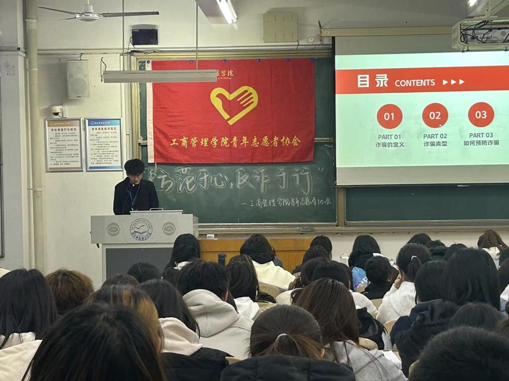 304永利集团官网入口青年志愿者协会积极发动学院志愿者踊跃参与,活动采用宣讲会的形式开展,宣讲员通过借助短视频这一媒介,给同学们对诈骗的定义、种类、识别方法和预防措施进行了详细讲解。志愿者们在整个活动过程中全神贯注地倾听,此次活动不仅使同学们掌握防诈骗知识,还营造了全员防诈骗的校园环境。