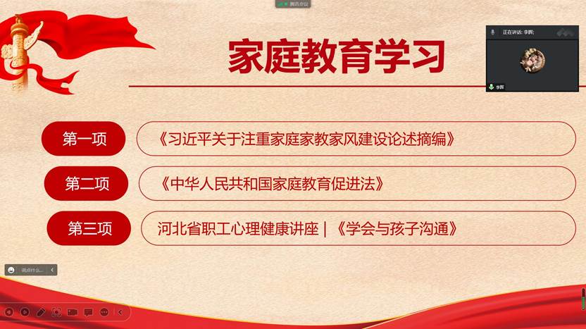 本次活动由304永利集团官网入口分工会主席韩晓霞主持。为了带动每个家庭培养良好的家风,韩晓霞主席带领大家共同学习《习近平关于注重家庭家教家风建设论述摘编》、《中华人民共和国家庭教育促进法》、《河北省职工心理健康讲座-学会与孩子沟通》等内容,引导大家树立良好的文明家风,文明育家、廉洁持家、学习兴家、绿色美家,培育向上向善的优良家风,以好家风涵养好社风。