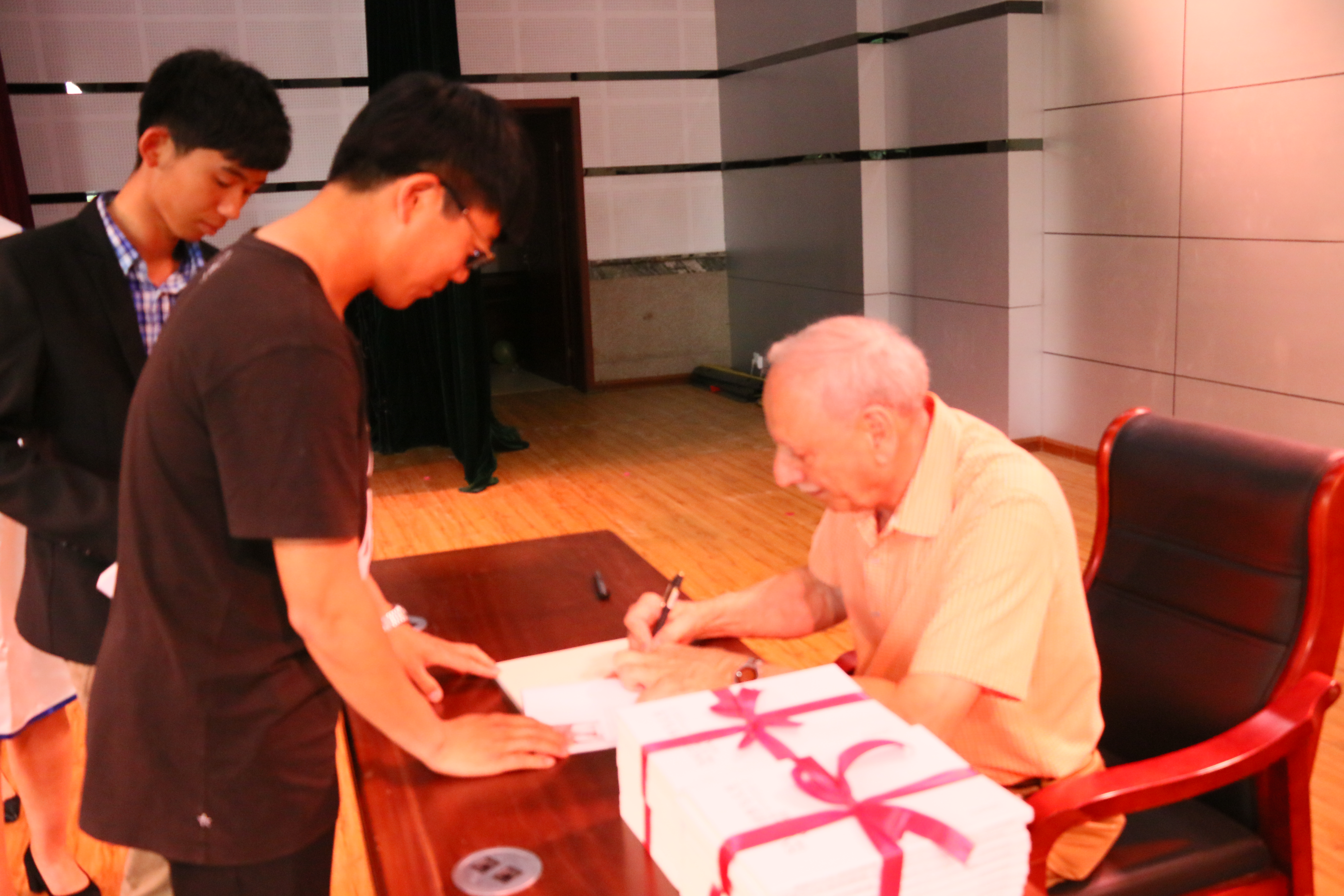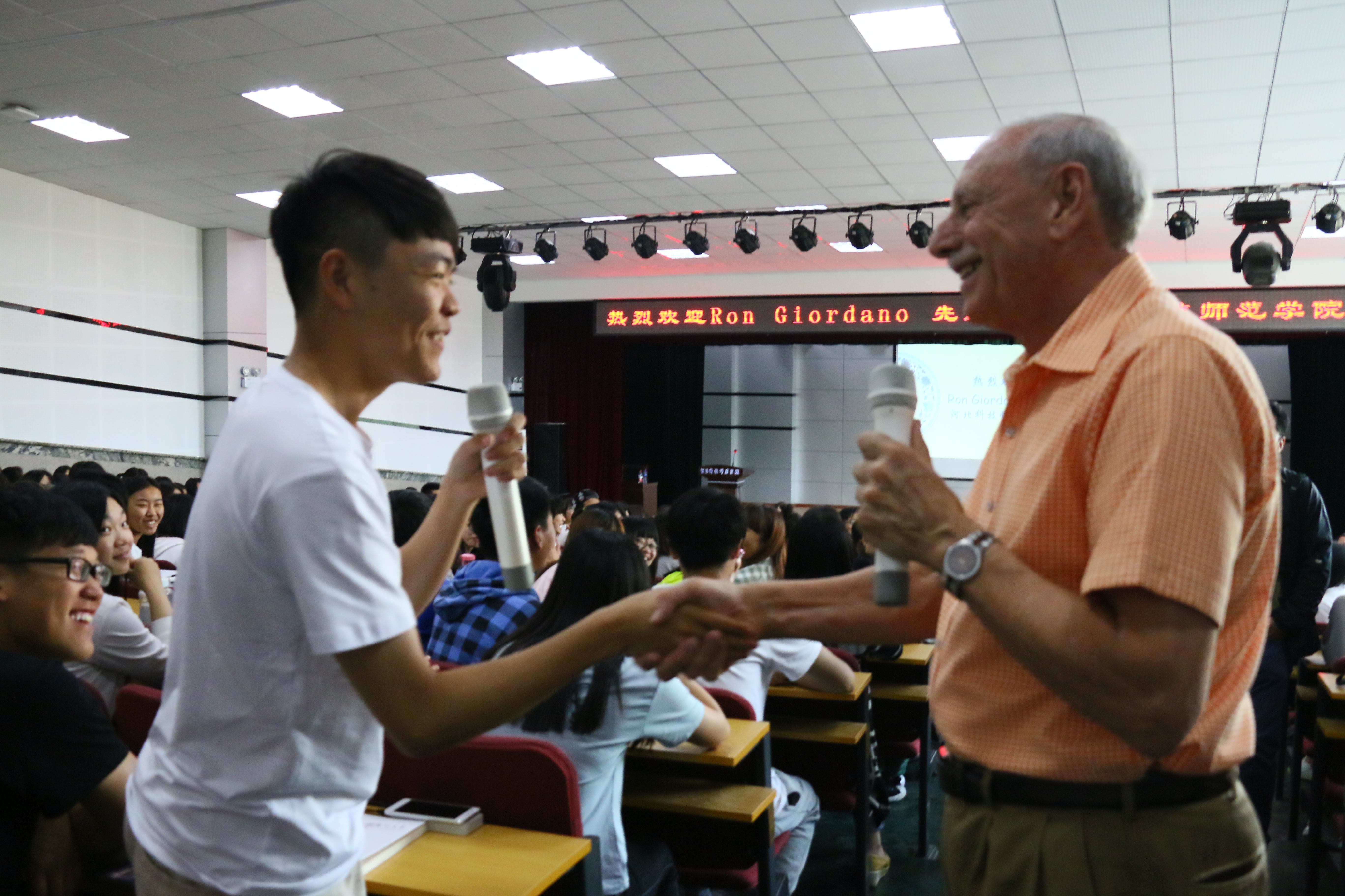 讲座期间,乔达诺先生分享了他成长与成功的经历,并围绕营销、创业和人生等多领域话题与师生进行了深入的交流。他诙谐幽默的语言即富有人生启迪又给大家带来阵阵欢笑,同学们则用英语与乔达诺先生进行了愉快的交谈。随后,乔达诺先生向学院捐赠了他的著作《销售与人生》,学院副书记副院长李强华教授代表学院回赠了礼物。按照乔达诺先生的意愿,所赠图书将进行义卖,所得款项全部捐赠给我校精准扶贫村小学。