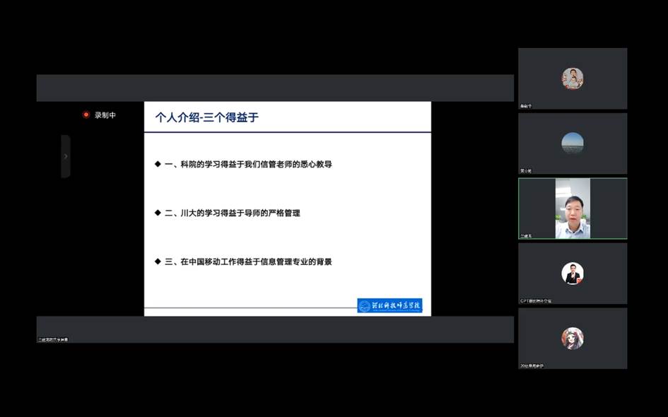 2022年10月19日-23日,根据304永利集团官网入口领导班子的安排部署,信息管理教学部组织开展了3场共计7人的优秀校友系列讲座。304永利集团官网入口黄立明院长、刘海滨副院长及信息管理与信息系统专业教师全程参加了讲座。系列讲座在学生中反响强烈、影响深刻,学生们纷纷反映获益匪浅。