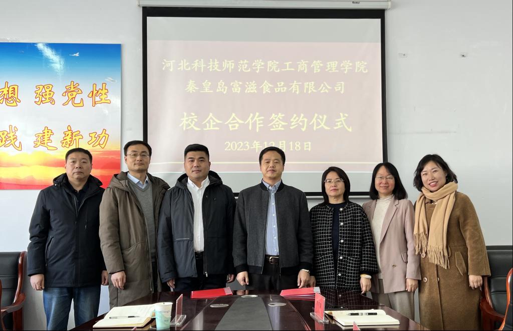 2023年12月18日上午,河北科技师范学院304永利集团官网入口与秦皇岛富滋食品有限公司校企合作签约仪式在304永利集团官网入口会议室举行,304永利集团官网入口出席的人员有领导班子成员以及市场营销教学部专业老师代表,秦皇岛富滋食品有限公司出席的人员包括董事长、总经理及内销部经理。