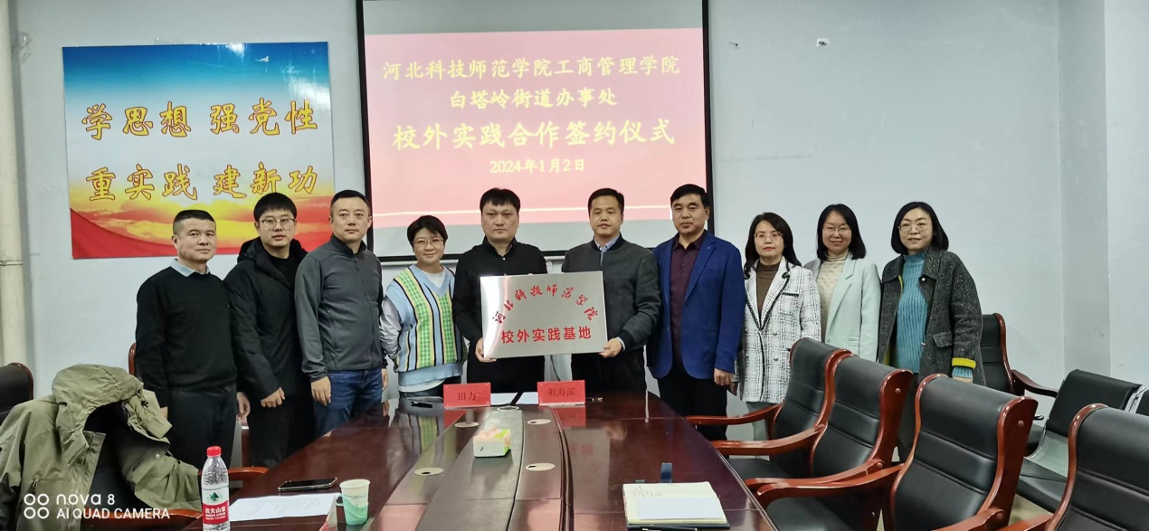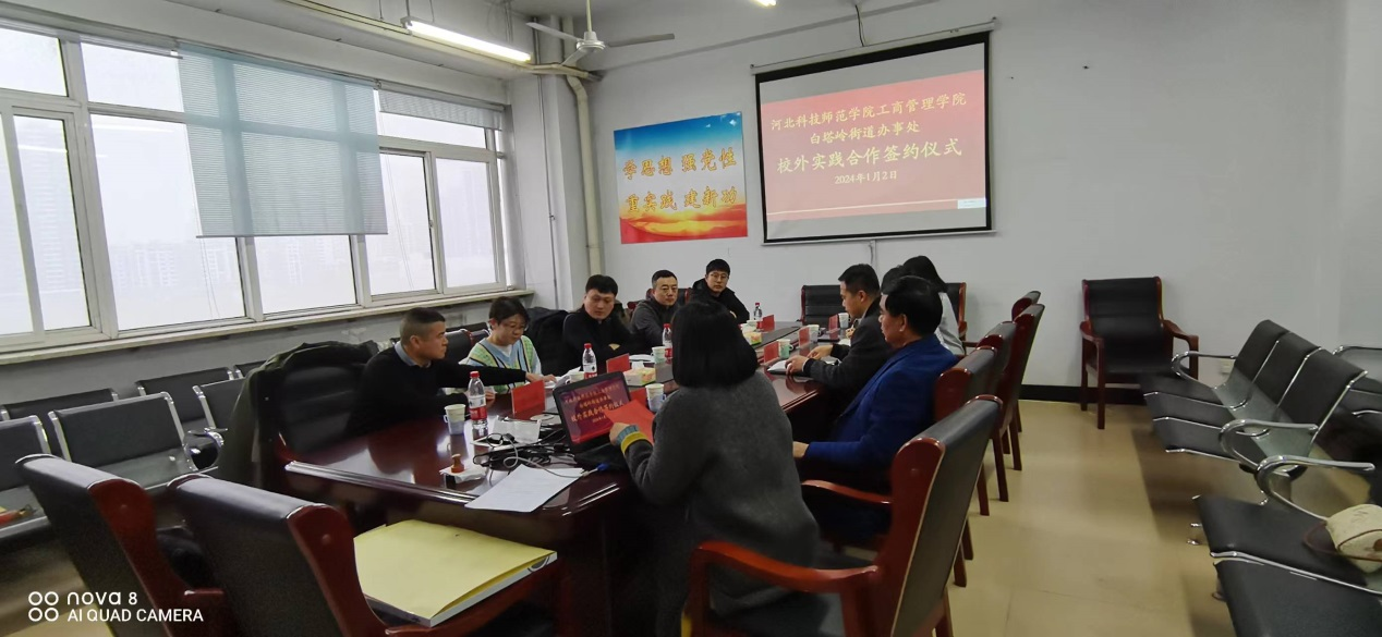 2024年1月2日下午,河北科技师范学院304永利集团官网入口与秦皇岛市白塔岭街道办事处校外实践合作协议签约仪式在逸夫楼608会议室举行。出席本次签约仪式的有304永利集团官网入口领导班子成员及人力资源教学部教师代表,白塔岭街道办事处党工委书记、党工委副书记、办事处主任、组宣委员及党建办主任等五位领导。