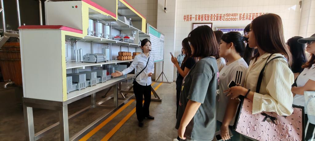 9月17日上午,师生们还参观了位于昌黎县碣石山产区的朗格斯酒庄。酒庄讲解员向同学们讲述了“朗格斯”名字的由来、酒庄的发展历史与概况。同学们依次参观了葡萄酒的生产加工车间、蕴藏陈酿的地下酒窖,了解了酒庄从葡萄有机栽培、自然重力酿造法到独具特色的葡萄酒文化。朗格斯酒庄自1999年创立以来,始终坚持高标准建设与精细化运营,其“美好酝酿、自然品味”的理念以及在对产品品质不懈追求过程中体现出的人文关怀,给同学们留下了深刻印象。
