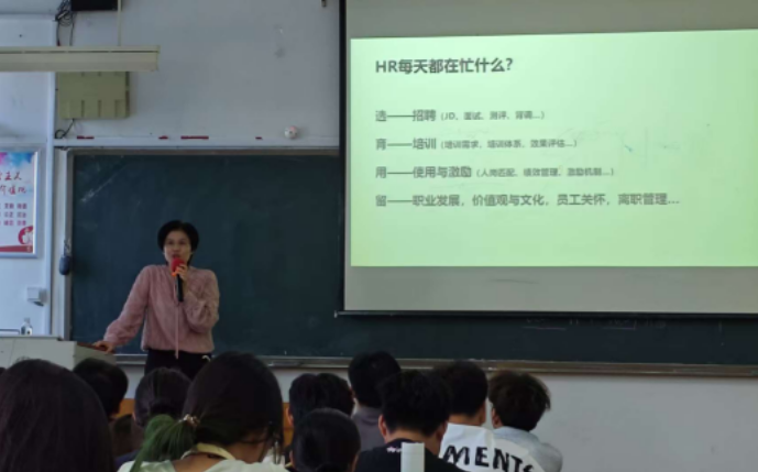 9月18日上午,为使学生进一步增强对专业的认知,更好地契合学校及用人单位对应用型人才的需求,学院特邀张明明女士为同学们举行了以“从课本到职场”为主题的讲座。张明明女士曾在正大集团、王府井集团任职,担任过公司人力资源总监、地区人才发展总监等多个职位。本次讲座针对同学们在专业学习方法、职场发展路径以及新人阶段可能面临的挑战等方面,进行了细致且生动地阐释。