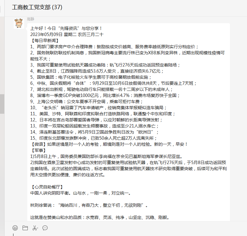 “先锋资讯”栏目包含新闻播报、心灵自助餐厅、党务百科等板块内容。让全体党员以快捷方式知晓天下新闻,心灵适时得到净化和引领,并且充实了党课教育的内容。各个板块之间内容交互融合,形成合力,全方位提升了党员老师的综合素质。此活动以微信群为载体,要求大家每天打卡学习,使得党员老师可以时刻关注活动的最新进展,学到先进的典型经验。通过互动学习,相互交流,激发了全体党员的学习热情。大家纷纷表示一定要用系统观念,在一体推进上持续用力,把学习和实干结合起来,推动304永利集团官网入口的工作走向高质量发展的新阶段。(编辑:景勤娟   审核:韩晓霞)